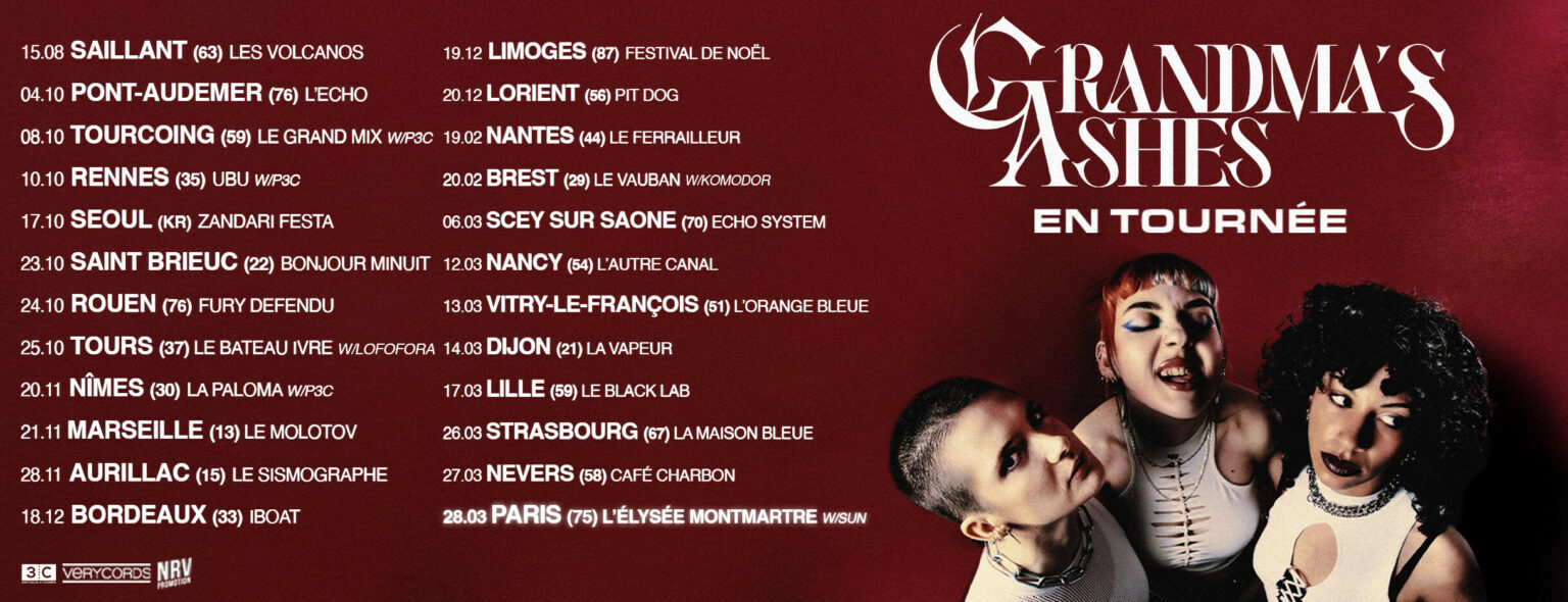 GRANDMA’S ASHES entame cet automne une grande tournée dans toute la France, les conduisant jusqu’à l’Elysée Montmartre le 28 mars 2026, en compagnie de SUN.
